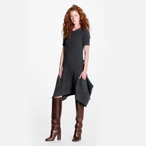 Em um jogo de volumes enxutos e amplos, o corpo deste vestido T imita uma camiseta com gola careca e mangas curtas, enquanto a saia apresenta os bolsos laterais oversized exclusivos da coleção. Confeccionado em malha de cashmere canelada e confortável que valoriza a silhueta, o modelo traz uma etiqueta discreta em canvas Monogram na lateral.