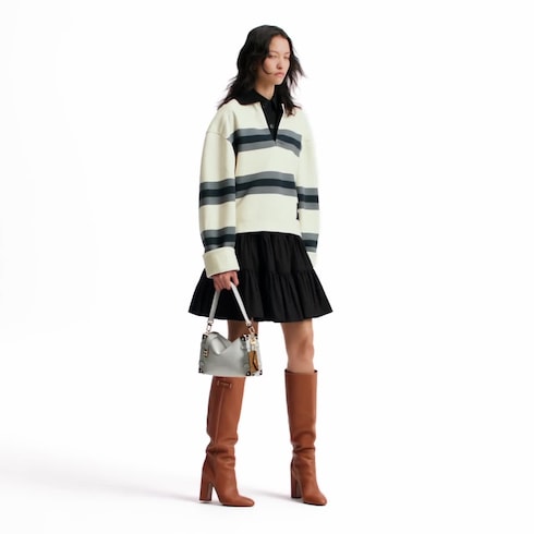 Esta sofisticada edição da bolsa Side Trunk MM apresenta a nova assinatura Minigram Bold, com padronagem sutil em relevo no couro de vitelo e destaque para as ferragens douradas, incluindo detalhes de baús que homenageiam a tradição da Maison. O charm Monogram representa o convite para o desfile da coleção de estreia de Nicolas Ghesquière e pode acomodar um cartão.
