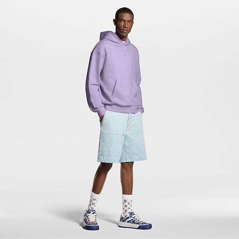 Crafted from organic denim in a pale washed indigo, these summery workwear shorts embody this collection’s casual elegance. They are elevated with gold-toned cursive Louis Vuitton embroidery on a rear pocket, while Monogram Flower rivets adorn the front. Finishing touches include tobacco-toned topstitching and a chic pearly button fastening. A matching blouson makes a seasonal set.