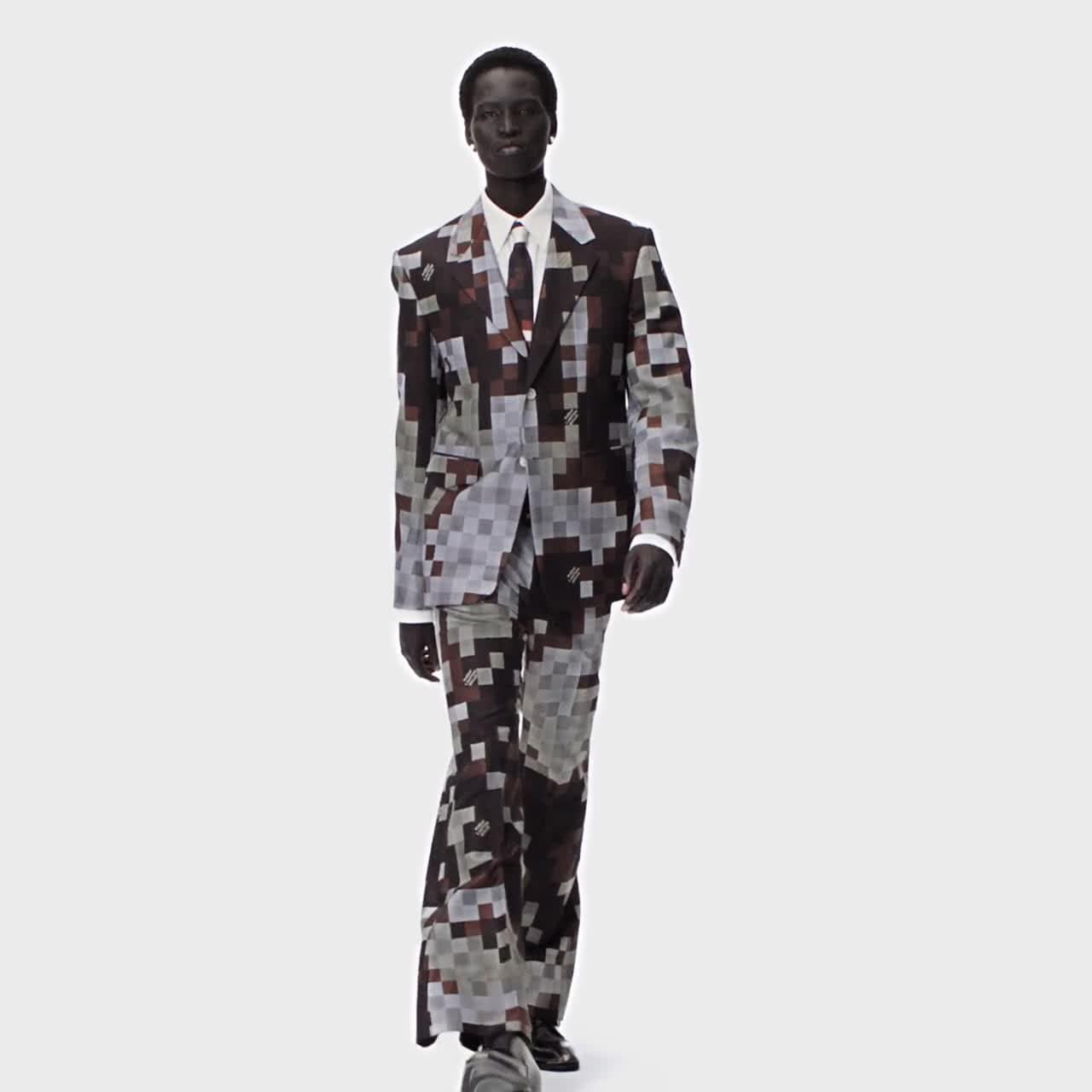Este blazer sob medida traz a fusão do oeste americano com o savoir-faire da Louis Vuitton. O divertido padrão Damoflage do desfile Fall-Winter 24 revisita o padrão Damier, confeccionado em jacquard com uma mescla de lã e seda. Assinaturas “Marque L.Vuitton déposée” realçam a estampa, enquanto os botões perolados trazem ainda mais elegância à peça.