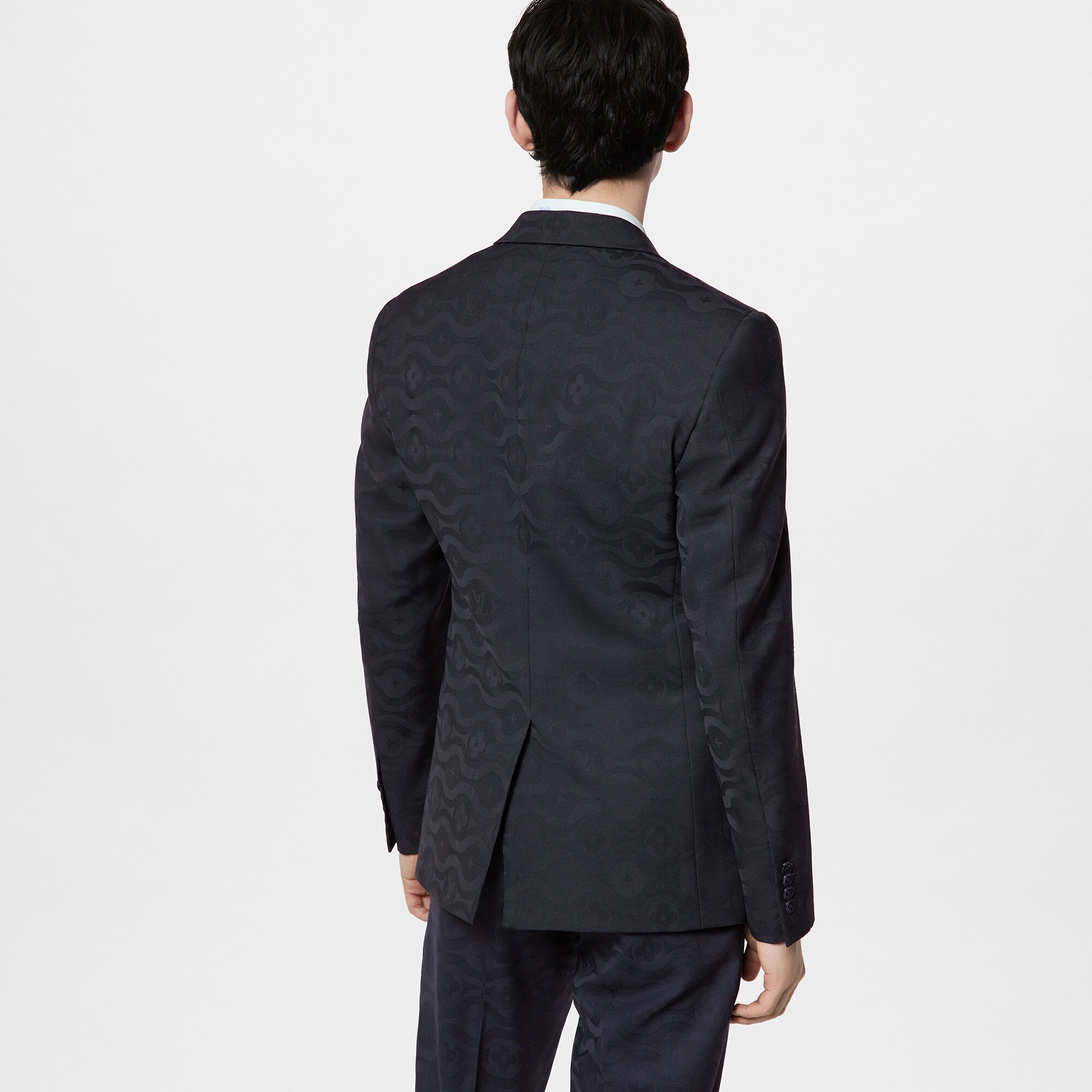 Este paletó Pont Neuf azul navy apresenta um sofisticado corte de fraque. Ele traz o padrão gráfico Monogram Wave desta coleção em um elegante jacquard tom sobre tom que realça o brilho da lã. A peça pode ser usada como terno, combinando com a calça cigarrete.