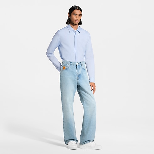 Esta calça jeans de skatista confeccionada em dênim japonês premium vem valorizada com o savoir-faire da Louis Vuitton. A clássica lavagem azul-claro e a silhueta marcante permitem combiná-la com qualquer look. Entre os detalhes exclusivos estão o pesponto marrom-tabaco, uma assinatura LV bordada em um bolso traseiro e patches de couro Nubuck assinados no bolso de tickets e na cintura.