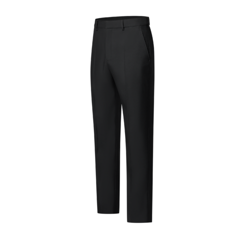 Esta elegante calça formal preta, confeccionada em lã de alfaiataria, apresenta uma silhueta slim que valoriza os looks formais. Uma etiqueta Marque L. Vuitton Déposée em tom sobre tom na trama assina o cós atrás. Esta peça básica e atemporal da moda masculina combina com outras peças de alfaiataria compondo um costume contemporâneo que é a cara desta coleção.