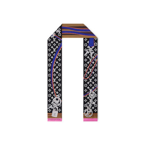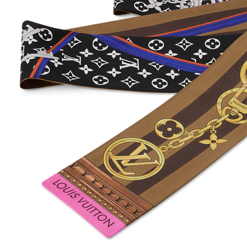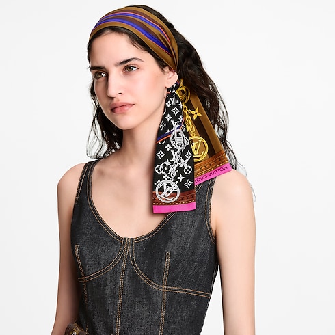 The bold design of the Strap And Trunk bandeau was inspired by the look of historic Monogram luggage from the 19th century. Printed on pure silk, it features a trunk-style leather strap plus a chain adorned with emblematic Louis Vuitton charms. An elegant, eye-catching accessory, and a tribute to the House’s heritage in the art of travel.