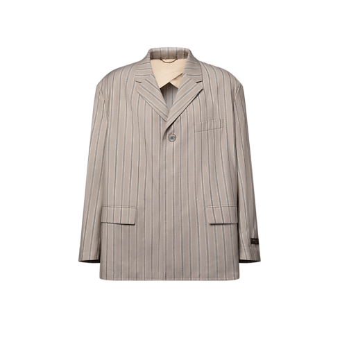 Este blazer leve com caimento solto e ombros desestruturados representa a elegância descontraída do desfile Spring-Summer 2026. Confeccionado em jacquard bege de lã e seda com listras, apresenta forro de alfaiaria listrado nas mangas, enquanto um patch de couro marrom Louis Vuitton Paris assina o braço esquerdo. Esta peça combina com um casaco da coleção para um visual digno das passarelas.