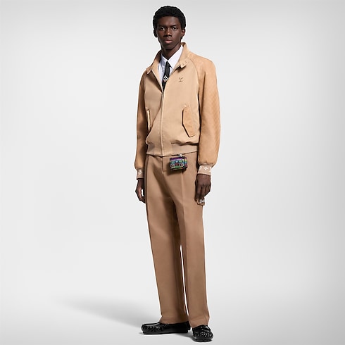 Esta jaqueta preppy reinventa um modelo clássico com elementos em suede com Damier em alto-relevo nos bolsos, mangas e na pala traseira. O corpo vem em gabardine de algodão macio. O Monogram em intársia tom sobre tom decora os punhos canelados e a parte interna da gola, enquanto um LV metálico decora o peito. Uma peça versátil, para todas as estações.