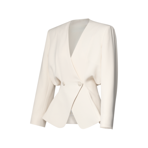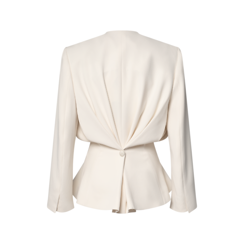 This double-breasted jacket from the runway makes an elegant statement in a defined silhouette inspired by the refined look of a robe. It is crafted from a structured silk blend with pronounced, padded shoulders and a billowing body that is fitted at the back for a romantic draped look, which is complemented by a fluid hemline.