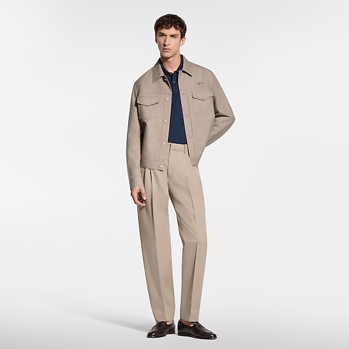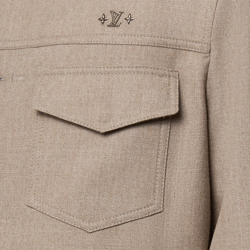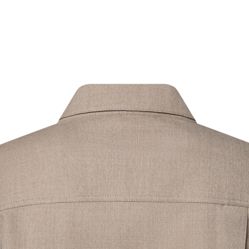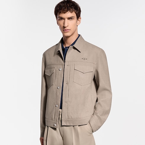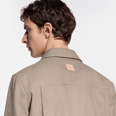 Confeccionada em seda e lã em um tom bege atemporal, é adornada com botões de efeito madrepérola e delicados ornamentos exclusivos no peito, enquanto um patch de couro LV assina as costas. Demonstrando uma elegância natural, esta peça leve é ideal para dias mais quentes.