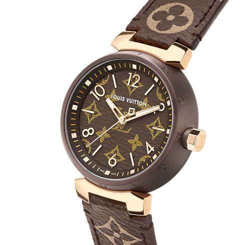 Modelo emblemático da Louis Vuitton, o relógio Tambour representa uma combinação de elegância discreta e personalidade forte. Produzido na manufatura La Fabrique du Temps, em Genebra, tem mostrador que reproduz o canvas Monogram, expressando a exclusividade da Maison. Este relógio versátil e atemporal mescla marrom e dourado em uma combinação perfeita para valorizar looks femininos.