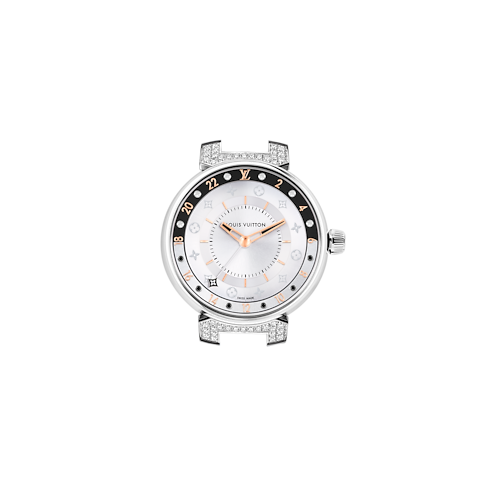 - Bicolor black and white flange with 12 diamonds, polished gold numerals and Louis Vuitton logo