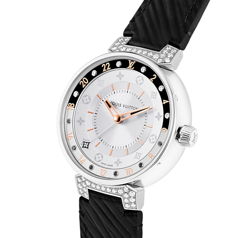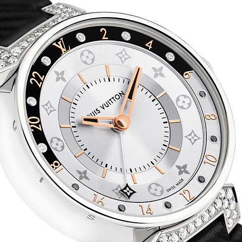 Feminino e sofisticado, o relógio Tambour Moon Dual Time Black & White expressa a arte de viajar. Os horários local e de origem são fáceis de ler no mostrador de 24 horas, gravado com Monogram Flowers que combinam com o ponteiro GMT, remetendo à tradição da Louis Vuitton. O efeito Sunray no mostrador côncavo cria um delicado jogo de luzes. Esta versão de 35 mm também inclui encaixes cravejados de diamantes.