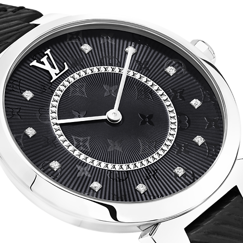 - Mostrador Sunray em guilloché preto com 11 indicadores de diamante (0,08 quilate), padrão Monogram em holograma, contador de minutos LV lozine espelhado e LV Initials às 12 horas.