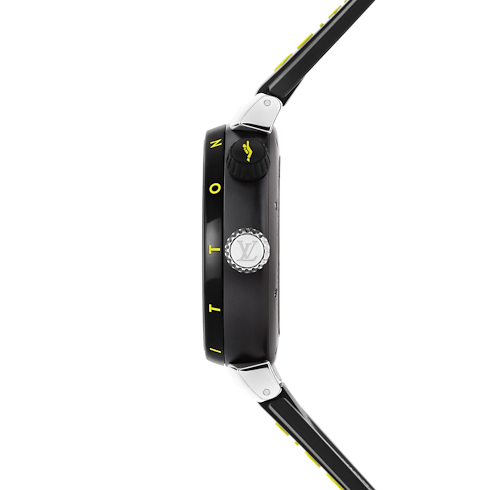 Robusto e ousado, o relógio Tambour Street Diver é o modelo mais esportivo e também mais versátil da Maison. O modelo Neon Black apresenta um estilo moderno em alto contraste, com tons de preto e amarelo fluo se complementando no mostrador, na caixa e na pulseira. Combinando funções tradicionais de mergulho com um design colorido e criativo, ele é puramente Louis Vuitton.
