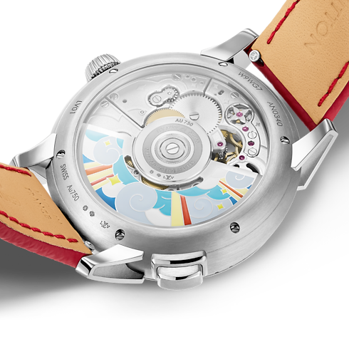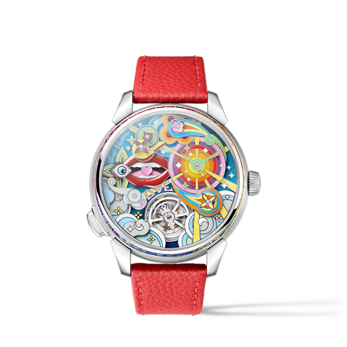 O relógio Tambour Taiko Arty Automata 42mm em ouro branco 18K convida a uma trajetória sensorial e surreal. Ao pressionar um botão, o mostrador dá início a um espetáculo colorido com sete animações. O mecanismo Automata é impulsionado por um calibre automático desenvolvido e manufaturado internamente pela La Fabrique du Temps Louis Vuitton, enquanto o espírito inovador da La Fabrique des Arts ganha vida em um espetáculo extraordinário no mostrador, realizado pela técnica de esmaltação Grand Feu.