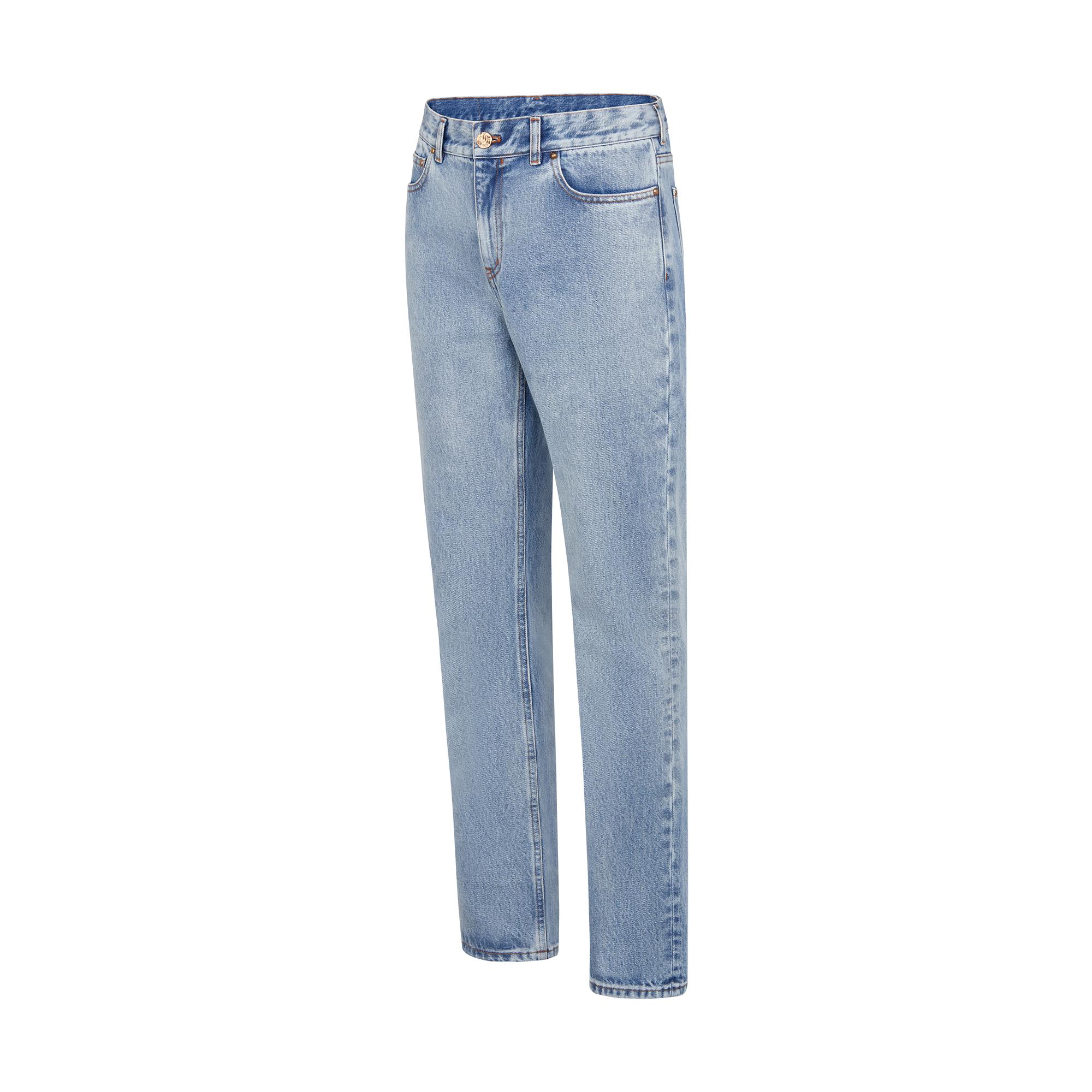 Esse jeans slim fit é confeccionado com o autêntico denim azul estonado. Os bolsos traseiros pontiagudos dão um toque inconfundível à peça e a aba de couro com um grampo exclusivo apresenta a assinatura Louis Vuitton. Esta calça pode ser combinada com uma jaqueta jeans em um look completo.