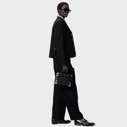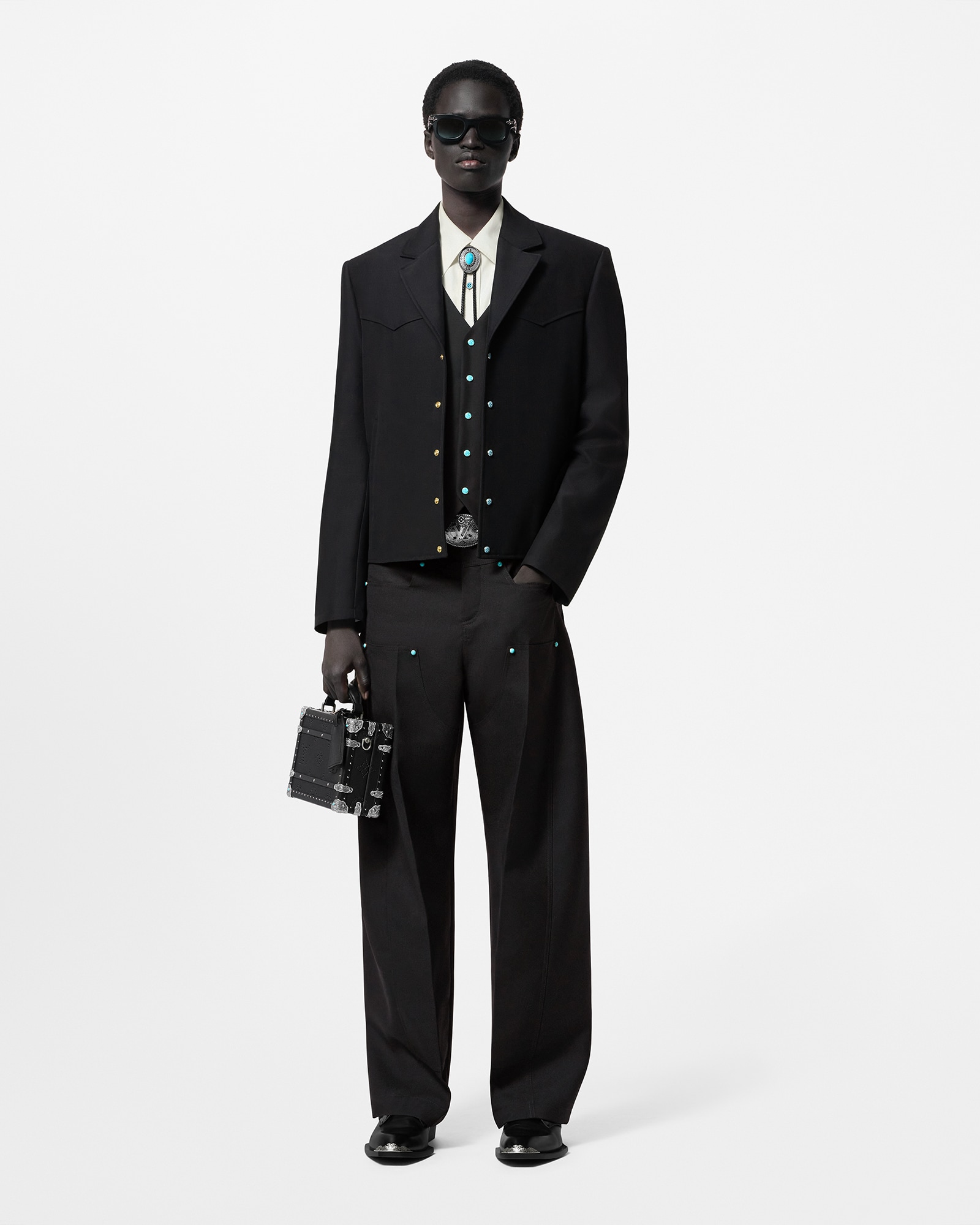 Este blazer preto do desfile Fall-Winter 24 traz um toque contemporâneo à alfaiataria, com uma pala de inspiração country e bainha reta elaborada em mohair e lã proveniente de fontes responsáveis. Botões de pressão turquesa com Flores do Monogram conferem elegância ao visual. Versátil, esta peça pode ser usada como um terno moderno com calça de alfaiataria ou de forma mais casual.