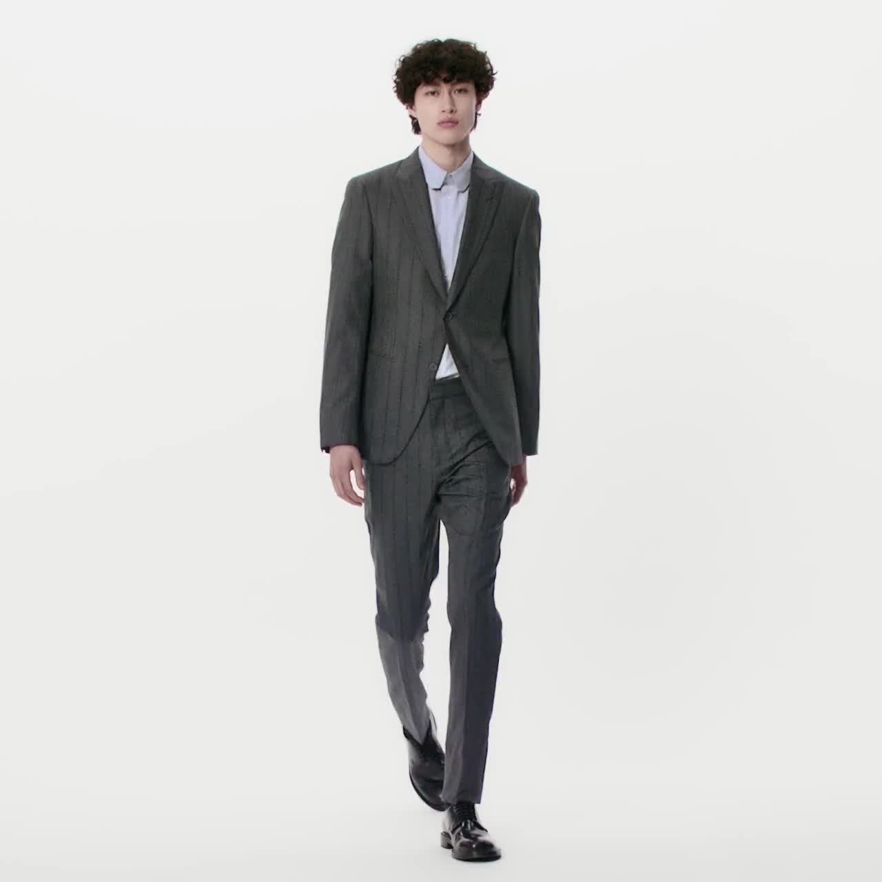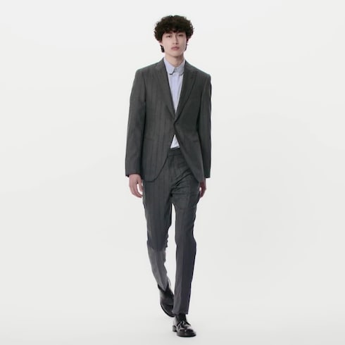 Esta calça de alfaiataria cinza-escura traz um toque moderno a looks formais do dia a dia. A peça, confeccionada em um sofisticado jacquard de mescla de lã e algodão, apresenta a sutil padronagem LV Stripes, na qual assinaturas discretas da Louis Vuitton criam um efeito que valoriza a silhueta. Elegante, combina perfeitamente com o paletó de fraque no mesmo estilo.