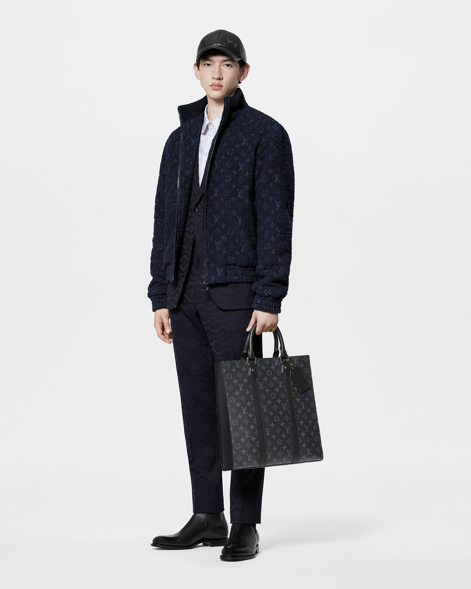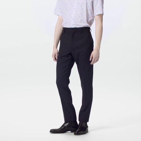 Esta calça cigarrete de alfaiataria traz um toque moderno ao terno do dia a dia graças à sua padronagem exclusiva. A peça, confeccionada em jacquard de lã azul navy, apresenta o design Monogram Wave com um sutil efeito gráfico ondulado. Essa calça pode ser usada com o paletó Pont Neuf para um look sofisticado.
