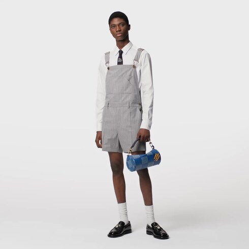Este macacão curto de verão é inspirado no tema náutico desta coleção, combinando a praticidade do estilo utilitário e a pegada dândi elegante da lã com padronagem risca-de-giz cinza. Esta peça statement é perfeita para os eventos ao ar livre.