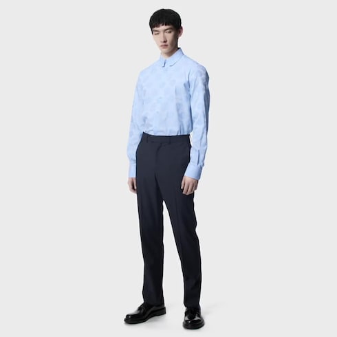 Esta refinada calça cigarrete azul navy é um clássico atemporal da alfaiataria masculina com um toque contemporâneo. Um sutil jacquard Monogram Stripes no mesmo tom realça a silhueta alongada e assina a peça. Este sofisticado modelo pode ser usado como um terno se combinado com o blazer da mesma coleção.
