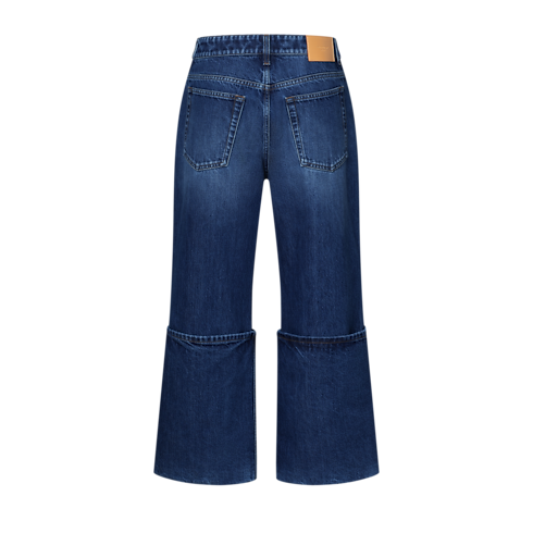 A play of proportion refreshes these staple jeans with a statement twist. They have a classic look in raw denim in a subtle gradient finish accented with contrasting topstitching highlighting the construction. They are cut in a comfortable high-rise straight shape with exaggerated XL cuffs, one of which is discreetly signed with a leather LV Circle tab.