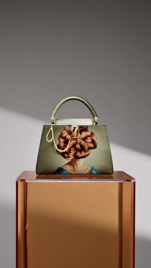 Borrifado à mão sobre couro liso, o fundo verde graduado reflete a obra original para mostrar o retrato vibrante, com detalhes capturados e reproduzidos em ultra-alta definição usando uma técnica inovadora de impressão 3D, que também foi empregada para camuflar a icônica assinatura LV. “Eu queria que a bolsa refletisse a essência e o caráter das minhas pinturas. Ao combinar diversas técnicas e materiais, como o couro tingido à mão e a impressão multicamadas, o efeito final é lindo e sofisticado.” –Ewa Juszkiewicz