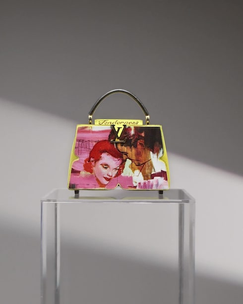 Demonstrando um savoir-faire único, milhares de pontos de bordado reproduzem pinceladas da pintura dos artistas feita em 2021, Tenderness, que são então meticulosamente impressas no painel frontal da bolsa em tons vibrantes, para acentuar sua profundidade. Este processo se repete no painel traseiro para transpor uma paleta caleidoscópica, numa representação conceitual de recomeçar perpetuamente. “Essa obra faz parte de uma série de pinturas ‘sentimentais’, que se baseiam na fonte iconográfica de imagens publicitárias da década de 1950.” -Ida Tursic e Wilfried Mille